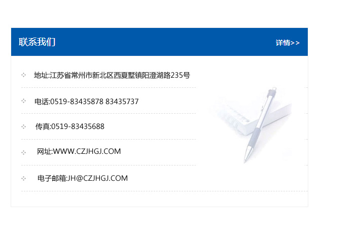 傳真:0519-83435688    郵編:213135    網址:WWW.czjhgj_com.shyz-culture.com    電子郵箱:JH@czjhgj_com.shyz-culture.com